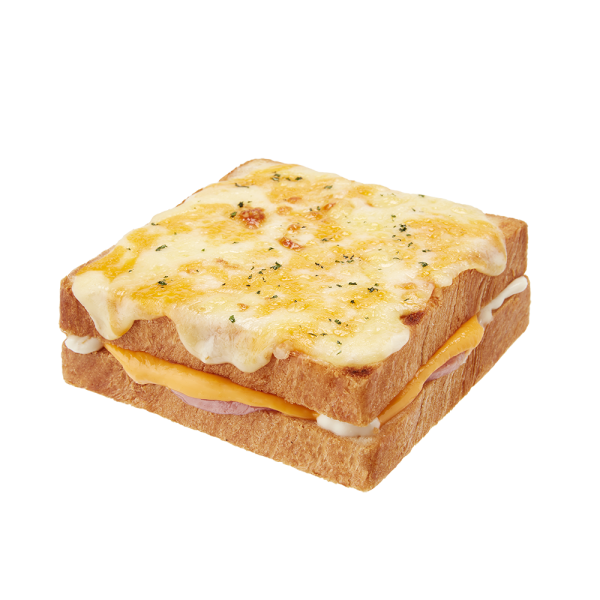 부드러운 페스츄리식빵에 4가지 치즈 (모짜렐라치즈, 체다치즈, 아메리칸치즈, 고다치즈)가 들어간 고소한 치즈 풍미의 크로크무슈