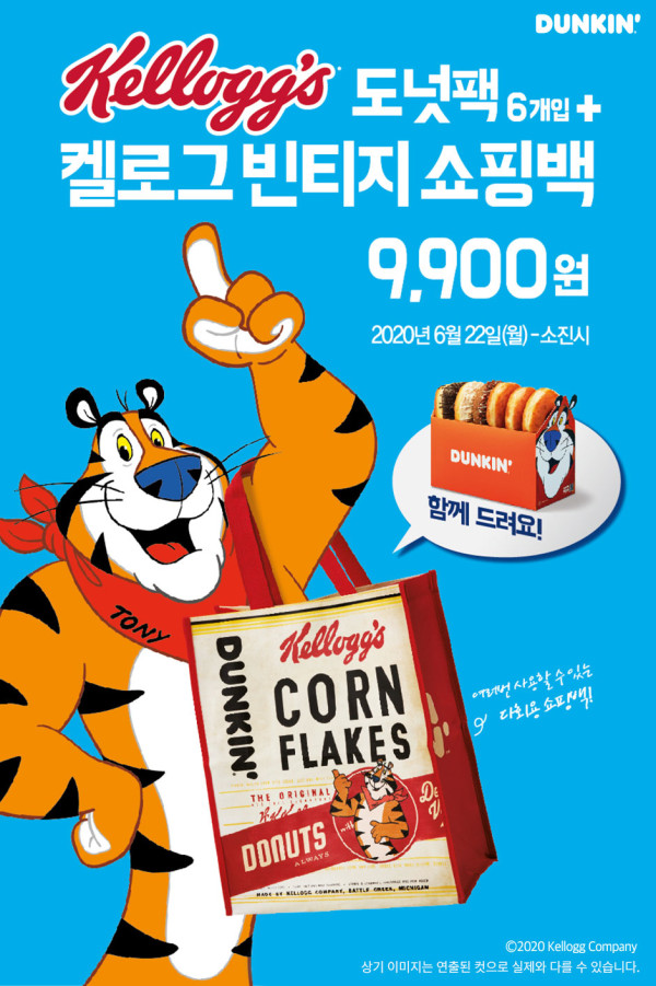 이번 프로모션은 던킨이 켈로그와 협업하여 출시한 ‘켈로그 도넛’을 ‘켈로그 빈티지 쇼핑백’과 함께 9,900원에 판매하는 행사다.